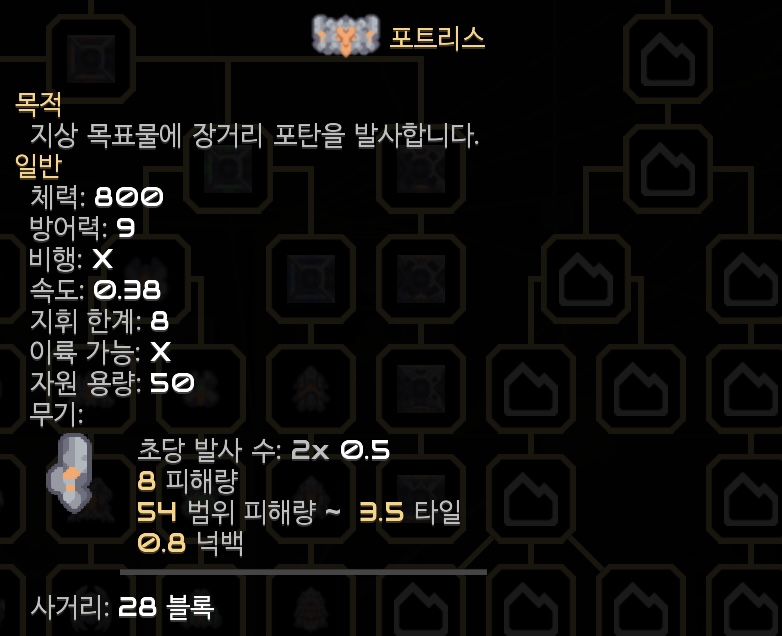 이번 섹터 124 공략에 사용할 유닛은 포트리스! 사거리는 28로 스펙터보다 3만큼 더 긴 사거리를 가지고 있습니다. 적 터렛들중 포트리스보다 더 긴 사거리를 가진 립플이 몇대 보이긴 하지만 조금의 피해는 감수하며 부셔버리면 됩니다.