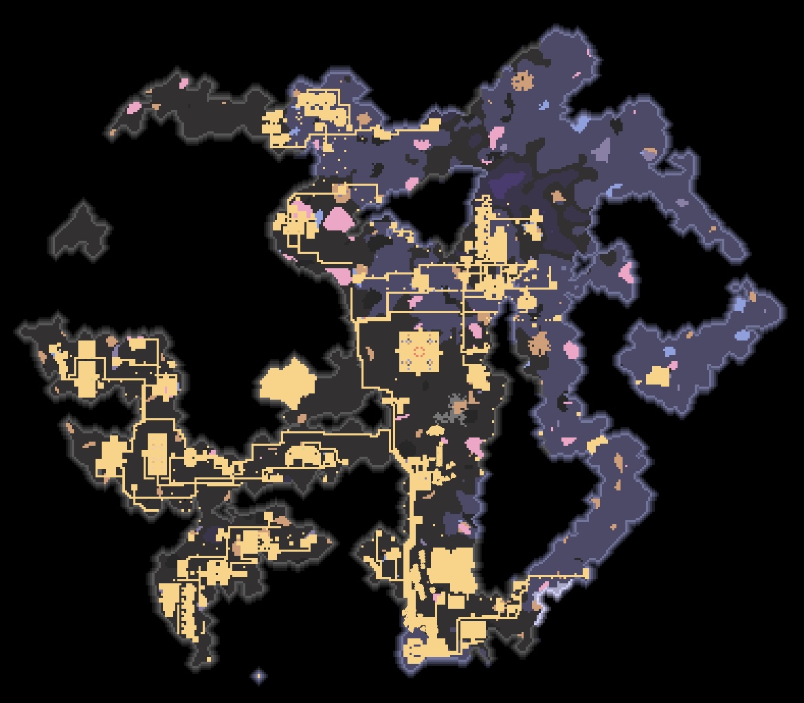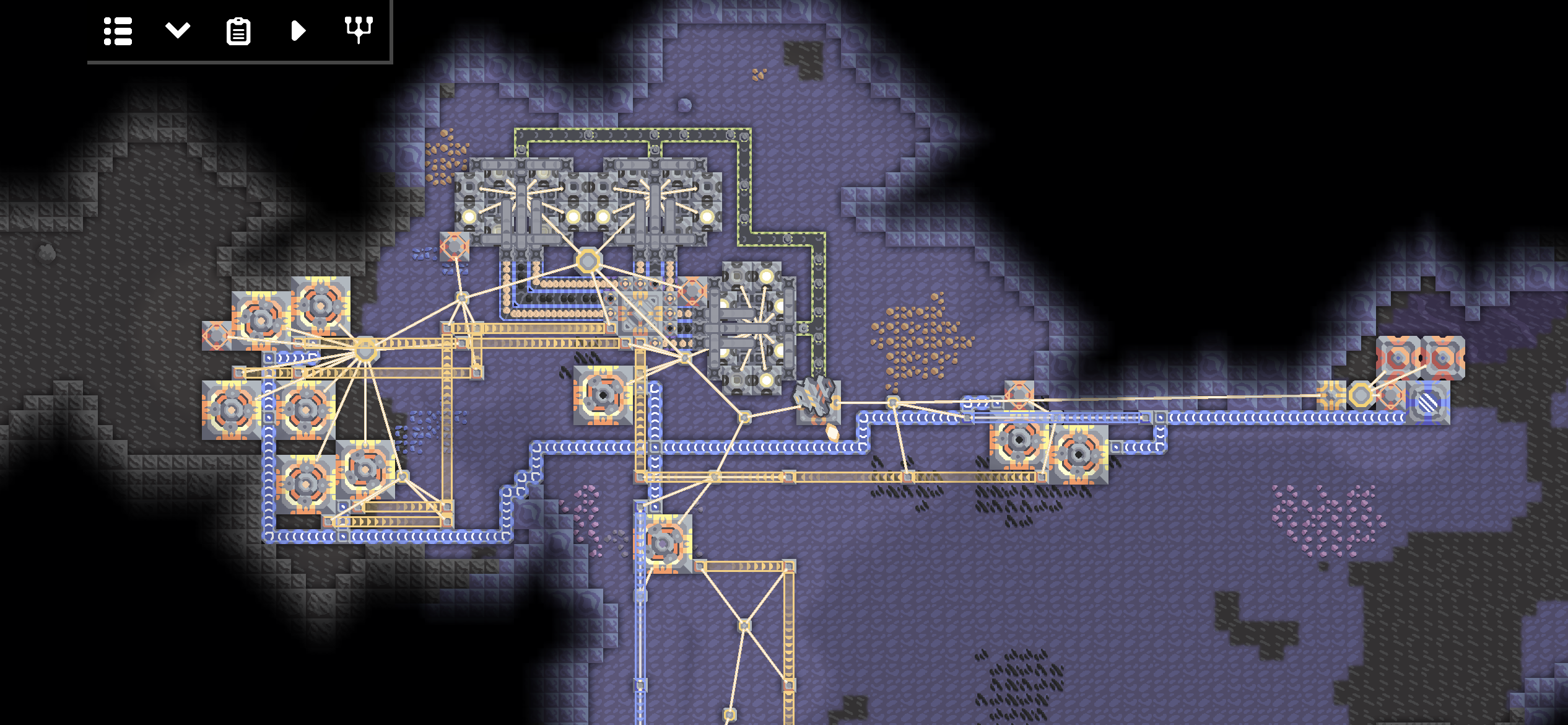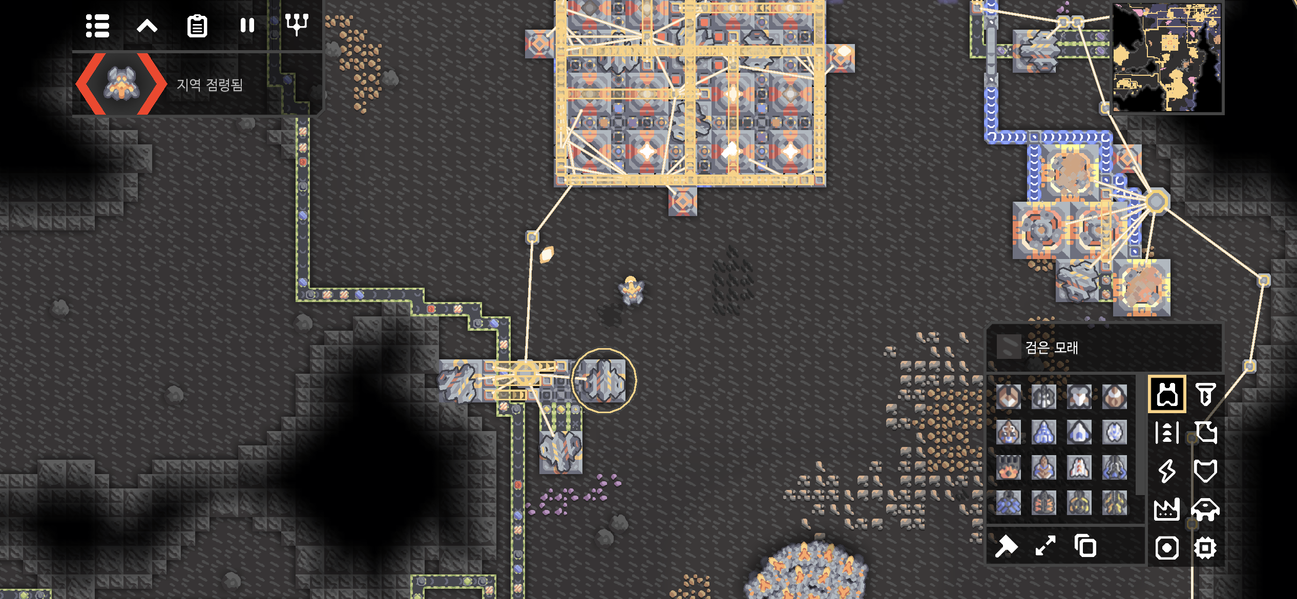 섹터 124 미니맵. 적이 넓은 영역을 차지하고 있습니다. 왼쪽은 검은 모래, 오른쪽은 타르로 이뤄진 지형입니다. 검은 모래와 티타늄으론 플라스터늄을, 토륨과 모래로는 메타를 생산하기에 좋겠네요.